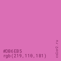 Цвет #DB6EB5 в цветовой модели RGB обозначается тремя октетами (219, 110, 181) в десятичном формате и #DB6EB5 в шестнадцатиричном (hex) формате, которые являются интенсивностью красного 219 (hex DB), интенсивность зелёного 110 (hex 6E) и интенсивность синего 181 (hex B5).
