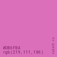 Цвет #DB6FBA в цветовой модели RGB обозначается тремя октетами (219, 111, 186) в десятичном формате и #DB6FBA в шестнадцатиричном (hex) формате, которые являются интенсивностью красного 219 (hex DB), интенсивность зелёного 111 (hex 6F) и интенсивность синего 186 (hex BA).