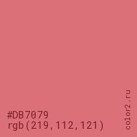 Цвет #DB7079 в цветовой модели RGB обозначается тремя октетами (219, 112, 121) в десятичном формате и #DB7079 в шестнадцатиричном (hex) формате, которые являются интенсивностью красного 219 (hex DB), интенсивность зелёного 112 (hex 70) и интенсивность синего 121 (hex 79).