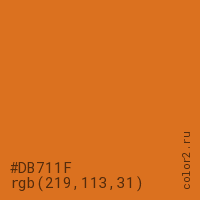 Цвет #DB711F в цветовой модели RGB обозначается тремя октетами (219, 113, 31) в десятичном формате и #DB711F в шестнадцатиричном (hex) формате, которые являются интенсивностью красного 219 (hex DB), интенсивность зелёного 113 (hex 71) и интенсивность синего 31 (hex 1F).