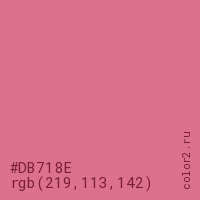 Цвет #DB718E в цветовой модели RGB обозначается тремя октетами (219, 113, 142) в десятичном формате и #DB718E в шестнадцатиричном (hex) формате, которые являются интенсивностью красного 219 (hex DB), интенсивность зелёного 113 (hex 71) и интенсивность синего 142 (hex 8E).