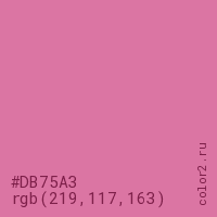 Цвет #DB75A3 в цветовой модели RGB обозначается тремя октетами (219, 117, 163) в десятичном формате и #DB75A3 в шестнадцатиричном (hex) формате, которые являются интенсивностью красного 219 (hex DB), интенсивность зелёного 117 (hex 75) и интенсивность синего 163 (hex A3).