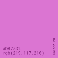 Цвет #DB75D2 в цветовой модели RGB обозначается тремя октетами (219, 117, 210) в десятичном формате и #DB75D2 в шестнадцатиричном (hex) формате, которые являются интенсивностью красного 219 (hex DB), интенсивность зелёного 117 (hex 75) и интенсивность синего 210 (hex D2).