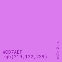 Цвет #DB7AEF в цветовой модели RGB обозначается тремя октетами (219, 122, 239) в десятичном формате и #DB7AEF в шестнадцатиричном (hex) формате, которые являются интенсивностью красного 219 (hex DB), интенсивность зелёного 122 (hex 7A) и интенсивность синего 239 (hex EF).