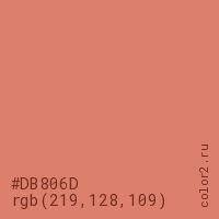 Цвет #DB806D в цветовой модели RGB обозначается тремя октетами (219, 128, 109) в десятичном формате и #DB806D в шестнадцатиричном (hex) формате, которые являются интенсивностью красного 219 (hex DB), интенсивность зелёного 128 (hex 80) и интенсивность синего 109 (hex 6D).
