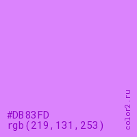 Цвет #DB83FD в цветовой модели RGB обозначается тремя октетами (219, 131, 253) в десятичном формате и #DB83FD в шестнадцатиричном (hex) формате, которые являются интенсивностью красного 219 (hex DB), интенсивность зелёного 131 (hex 83) и интенсивность синего 253 (hex FD).