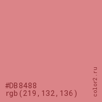 Цвет #DB8488 в цветовой модели RGB обозначается тремя октетами (219, 132, 136) в десятичном формате и #DB8488 в шестнадцатиричном (hex) формате, которые являются интенсивностью красного 219 (hex DB), интенсивность зелёного 132 (hex 84) и интенсивность синего 136 (hex 88).
