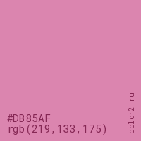 Цвет #DB85AF в цветовой модели RGB обозначается тремя октетами (219, 133, 175) в десятичном формате и #DB85AF в шестнадцатиричном (hex) формате, которые являются интенсивностью красного 219 (hex DB), интенсивность зелёного 133 (hex 85) и интенсивность синего 175 (hex AF).