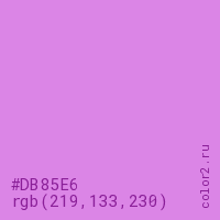 Цвет #DB85E6 в цветовой модели RGB обозначается тремя октетами (219, 133, 230) в десятичном формате и #DB85E6 в шестнадцатиричном (hex) формате, которые являются интенсивностью красного 219 (hex DB), интенсивность зелёного 133 (hex 85) и интенсивность синего 230 (hex E6).