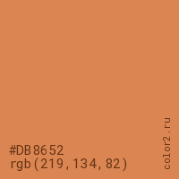 Цвет #DB8652 в цветовой модели RGB обозначается тремя октетами (219, 134, 82) в десятичном формате и #DB8652 в шестнадцатиричном (hex) формате, которые являются интенсивностью красного 219 (hex DB), интенсивность зелёного 134 (hex 86) и интенсивность синего 82 (hex 52).