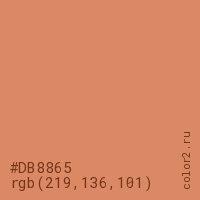 Цвет #DB8865 в цветовой модели RGB обозначается тремя октетами (219, 136, 101) в десятичном формате и #DB8865 в шестнадцатиричном (hex) формате, которые являются интенсивностью красного 219 (hex DB), интенсивность зелёного 136 (hex 88) и интенсивность синего 101 (hex 65).