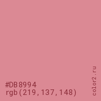 Цвет #DB8994 в цветовой модели RGB обозначается тремя октетами (219, 137, 148) в десятичном формате и #DB8994 в шестнадцатиричном (hex) формате, которые являются интенсивностью красного 219 (hex DB), интенсивность зелёного 137 (hex 89) и интенсивность синего 148 (hex 94).
