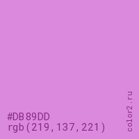 Цвет #DB89DD в цветовой модели RGB обозначается тремя октетами (219, 137, 221) в десятичном формате и #DB89DD в шестнадцатиричном (hex) формате, которые являются интенсивностью красного 219 (hex DB), интенсивность зелёного 137 (hex 89) и интенсивность синего 221 (hex DD).