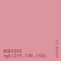 Цвет #DB959E в цветовой модели RGB обозначается тремя октетами (219, 149, 158) в десятичном формате и #DB959E в шестнадцатиричном (hex) формате, которые являются интенсивностью красного 219 (hex DB), интенсивность зелёного 149 (hex 95) и интенсивность синего 158 (hex 9E).