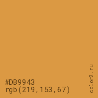 Цвет #DB9943 в цветовой модели RGB обозначается тремя октетами (219, 153, 67) в десятичном формате и #DB9943 в шестнадцатиричном (hex) формате, которые являются интенсивностью красного 219 (hex DB), интенсивность зелёного 153 (hex 99) и интенсивность синего 67 (hex 43).