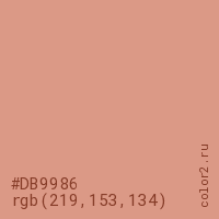 Цвет #DB9986 в цветовой модели RGB обозначается тремя октетами (219, 153, 134) в десятичном формате и #DB9986 в шестнадцатиричном (hex) формате, которые являются интенсивностью красного 219 (hex DB), интенсивность зелёного 153 (hex 99) и интенсивность синего 134 (hex 86).