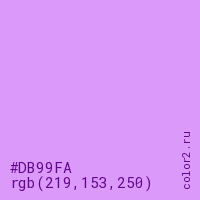 Цвет RGB(219, 153, 250) в процентом отношении количества цвета состоит из 85.9% красного (red), 60% зелёного (green) и 98% синего (blue).