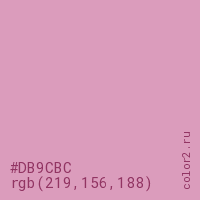 Цвет #DB9CBC в цветовой модели RGB обозначается тремя октетами (219, 156, 188) в десятичном формате и #DB9CBC в шестнадцатиричном (hex) формате, которые являются интенсивностью красного 219 (hex DB), интенсивность зелёного 156 (hex 9C) и интенсивность синего 188 (hex BC).
