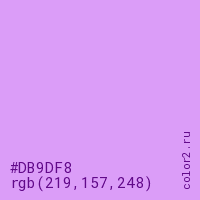 Цвет #DB9DF8 в цветовой модели RGB обозначается тремя октетами (219, 157, 248) в десятичном формате и #DB9DF8 в шестнадцатиричном (hex) формате, которые являются интенсивностью красного 219 (hex DB), интенсивность зелёного 157 (hex 9D) и интенсивность синего 248 (hex F8).