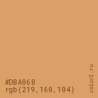 Цвет #DBA068 в цветовой модели RGB обозначается тремя октетами (219, 160, 104) в десятичном формате и #DBA068 в шестнадцатиричном (hex) формате, которые являются интенсивностью красного 219 (hex DB), интенсивность зелёного 160 (hex A0) и интенсивность синего 104 (hex 68).