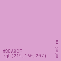 Цвет #DBA0CF в цветовой модели RGB обозначается тремя октетами (219, 160, 207) в десятичном формате и #DBA0CF в шестнадцатиричном (hex) формате, которые являются интенсивностью красного 219 (hex DB), интенсивность зелёного 160 (hex A0) и интенсивность синего 207 (hex CF).