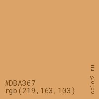 Цвет #DBA367 в цветовой модели RGB обозначается тремя октетами (219, 163, 103) в десятичном формате и #DBA367 в шестнадцатиричном (hex) формате, которые являются интенсивностью красного 219 (hex DB), интенсивность зелёного 163 (hex A3) и интенсивность синего 103 (hex 67).