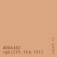 Цвет #DBA483 в цветовой модели RGB обозначается тремя октетами (219, 164, 131) в десятичном формате и #DBA483 в шестнадцатиричном (hex) формате, которые являются интенсивностью красного 219 (hex DB), интенсивность зелёного 164 (hex A4) и интенсивность синего 131 (hex 83).