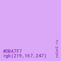 Цвет #DBA7F7 в цветовой модели RGB обозначается тремя октетами (219, 167, 247) в десятичном формате и #DBA7F7 в шестнадцатиричном (hex) формате, которые являются интенсивностью красного 219 (hex DB), интенсивность зелёного 167 (hex A7) и интенсивность синего 247 (hex F7).