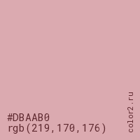 Цвет #DBAAB0 в цветовой модели RGB обозначается тремя октетами (219, 170, 176) в десятичном формате и #DBAAB0 в шестнадцатиричном (hex) формате, которые являются интенсивностью красного 219 (hex DB), интенсивность зелёного 170 (hex AA) и интенсивность синего 176 (hex B0).