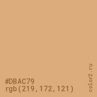 Цвет #DBAC79 в цветовой модели RGB обозначается тремя октетами (219, 172, 121) в десятичном формате и #DBAC79 в шестнадцатиричном (hex) формате, которые являются интенсивностью красного 219 (hex DB), интенсивность зелёного 172 (hex AC) и интенсивность синего 121 (hex 79).