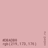 Цвет #DBADB0 в цветовой модели RGB обозначается тремя октетами (219, 173, 176) в десятичном формате и #DBADB0 в шестнадцатиричном (hex) формате, которые являются интенсивностью красного 219 (hex DB), интенсивность зелёного 173 (hex AD) и интенсивность синего 176 (hex B0).