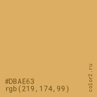 Цвет #DBAE63 в цветовой модели RGB обозначается тремя октетами (219, 174, 99) в десятичном формате и #DBAE63 в шестнадцатиричном (hex) формате, которые являются интенсивностью красного 219 (hex DB), интенсивность зелёного 174 (hex AE) и интенсивность синего 99 (hex 63).