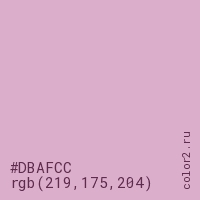 Цвет #DBAFCC в цветовой модели RGB обозначается тремя октетами (219, 175, 204) в десятичном формате и #DBAFCC в шестнадцатиричном (hex) формате, которые являются интенсивностью красного 219 (hex DB), интенсивность зелёного 175 (hex AF) и интенсивность синего 204 (hex CC).
