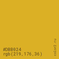 Цвет #DBB024 в цветовой модели RGB обозначается тремя октетами (219, 176, 36) в десятичном формате и #DBB024 в шестнадцатиричном (hex) формате, которые являются интенсивностью красного 219 (hex DB), интенсивность зелёного 176 (hex B0) и интенсивность синего 36 (hex 24).