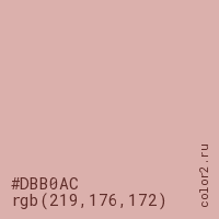 Цвет #DBB0AC в цветовой модели RGB обозначается тремя октетами (219, 176, 172) в десятичном формате и #DBB0AC в шестнадцатиричном (hex) формате, которые являются интенсивностью красного 219 (hex DB), интенсивность зелёного 176 (hex B0) и интенсивность синего 172 (hex AC).