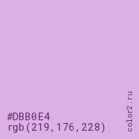 Цвет #DBB0E4 в цветовой модели RGB обозначается тремя октетами (219, 176, 228) в десятичном формате и #DBB0E4 в шестнадцатиричном (hex) формате, которые являются интенсивностью красного 219 (hex DB), интенсивность зелёного 176 (hex B0) и интенсивность синего 228 (hex E4).