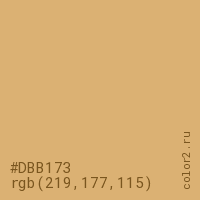 Цвет #DBB173 в цветовой модели RGB обозначается тремя октетами (219, 177, 115) в десятичном формате и #DBB173 в шестнадцатиричном (hex) формате, которые являются интенсивностью красного 219 (hex DB), интенсивность зелёного 177 (hex B1) и интенсивность синего 115 (hex 73).