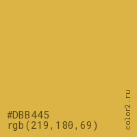 Цвет #DBB445 в цветовой модели RGB обозначается тремя октетами (219, 180, 69) в десятичном формате и #DBB445 в шестнадцатиричном (hex) формате, которые являются интенсивностью красного 219 (hex DB), интенсивность зелёного 180 (hex B4) и интенсивность синего 69 (hex 45).