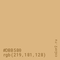 Цвет #DBB580 в цветовой модели RGB обозначается тремя октетами (219, 181, 128) в десятичном формате и #DBB580 в шестнадцатиричном (hex) формате, которые являются интенсивностью красного 219 (hex DB), интенсивность зелёного 181 (hex B5) и интенсивность синего 128 (hex 80).