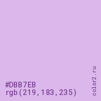 Цвет #DBB7EB в цветовой модели RGB обозначается тремя октетами (219, 183, 235) в десятичном формате и #DBB7EB в шестнадцатиричном (hex) формате, которые являются интенсивностью красного 219 (hex DB), интенсивность зелёного 183 (hex B7) и интенсивность синего 235 (hex EB).