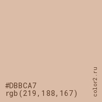 Цвет #DBBCA7 в цветовой модели RGB обозначается тремя октетами (219, 188, 167) в десятичном формате и #DBBCA7 в шестнадцатиричном (hex) формате, которые являются интенсивностью красного 219 (hex DB), интенсивность зелёного 188 (hex BC) и интенсивность синего 167 (hex A7).