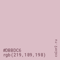Цвет #DBBDC6 в цветовой модели RGB обозначается тремя октетами (219, 189, 198) в десятичном формате и #DBBDC6 в шестнадцатиричном (hex) формате, которые являются интенсивностью красного 219 (hex DB), интенсивность зелёного 189 (hex BD) и интенсивность синего 198 (hex C6).