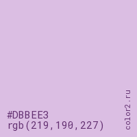 Цвет #DBBEE3 в цветовой модели RGB обозначается тремя октетами (219, 190, 227) в десятичном формате и #DBBEE3 в шестнадцатиричном (hex) формате, которые являются интенсивностью красного 219 (hex DB), интенсивность зелёного 190 (hex BE) и интенсивность синего 227 (hex E3).