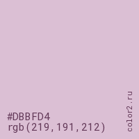 Цвет #DBBFD4 в цветовой модели RGB обозначается тремя октетами (219, 191, 212) в десятичном формате и #DBBFD4 в шестнадцатиричном (hex) формате, которые являются интенсивностью красного 219 (hex DB), интенсивность зелёного 191 (hex BF) и интенсивность синего 212 (hex D4).