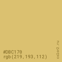 Цвет #DBC170 в цветовой модели RGB обозначается тремя октетами (219, 193, 112) в десятичном формате и #DBC170 в шестнадцатиричном (hex) формате, которые являются интенсивностью красного 219 (hex DB), интенсивность зелёного 193 (hex C1) и интенсивность синего 112 (hex 70).