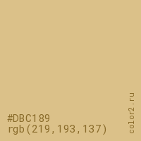 Цвет #DBC189 в цветовой модели RGB обозначается тремя октетами (219, 193, 137) в десятичном формате и #DBC189 в шестнадцатиричном (hex) формате, которые являются интенсивностью красного 219 (hex DB), интенсивность зелёного 193 (hex C1) и интенсивность синего 137 (hex 89).