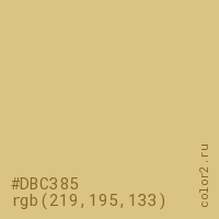 Цвет #DBC385 в цветовой модели RGB обозначается тремя октетами (219, 195, 133) в десятичном формате и #DBC385 в шестнадцатиричном (hex) формате, которые являются интенсивностью красного 219 (hex DB), интенсивность зелёного 195 (hex C3) и интенсивность синего 133 (hex 85).