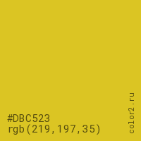 Цвет #DBC523 в цветовой модели RGB обозначается тремя октетами (219, 197, 35) в десятичном формате и #DBC523 в шестнадцатиричном (hex) формате, которые являются интенсивностью красного 219 (hex DB), интенсивность зелёного 197 (hex C5) и интенсивность синего 35 (hex 23).