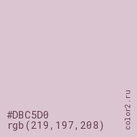 Цвет #DBC5D0 в цветовой модели RGB обозначается тремя октетами (219, 197, 208) в десятичном формате и #DBC5D0 в шестнадцатиричном (hex) формате, которые являются интенсивностью красного 219 (hex DB), интенсивность зелёного 197 (hex C5) и интенсивность синего 208 (hex D0).