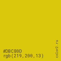 Цвет #DBC80D в цветовой модели RGB обозначается тремя октетами (219, 200, 13) в десятичном формате и #DBC80D в шестнадцатиричном (hex) формате, которые являются интенсивностью красного 219 (hex DB), интенсивность зелёного 200 (hex C8) и интенсивность синего 13 (hex 0D).